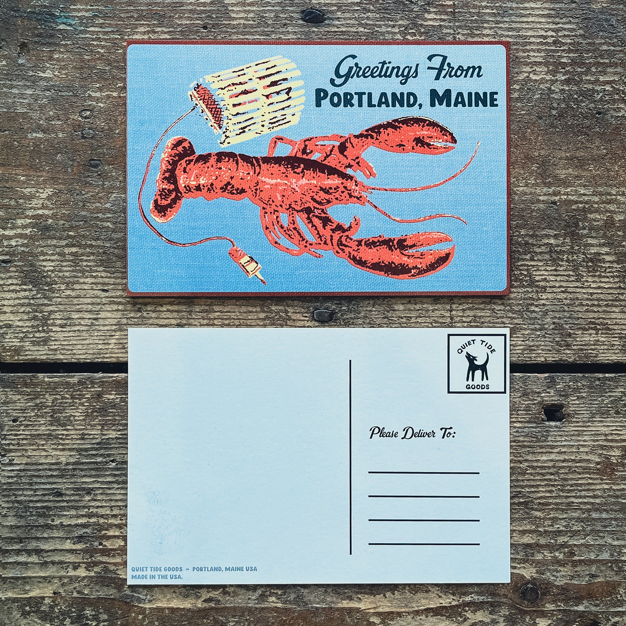 Postcard designs are based off of and use vintage Maine imagery that we find on our flea marketing and travels throughout Maine.